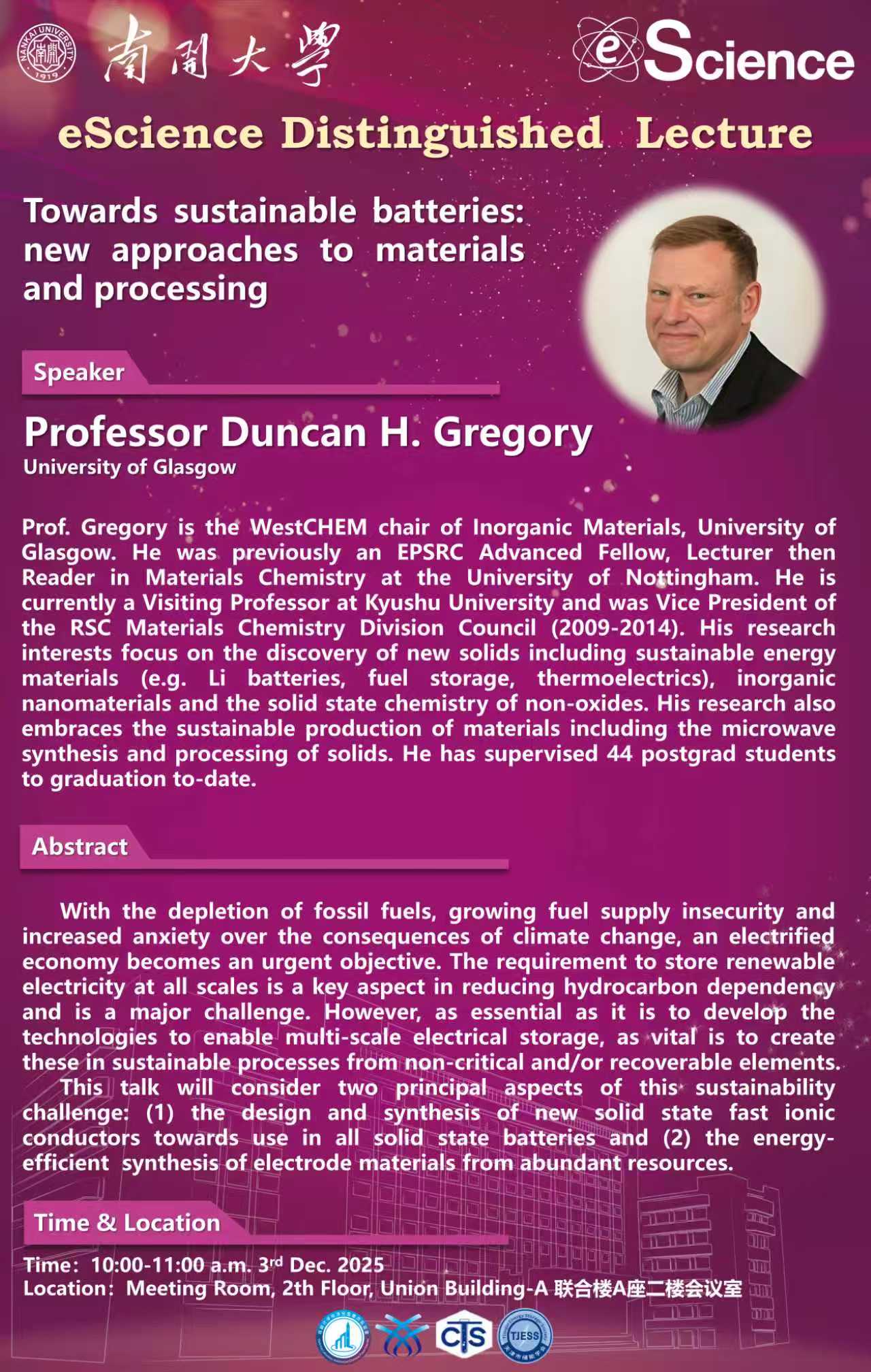 英国格拉斯哥大学 Duncan H. Gregory教授:Towards sustainable batteries: new approaches to materials and processing